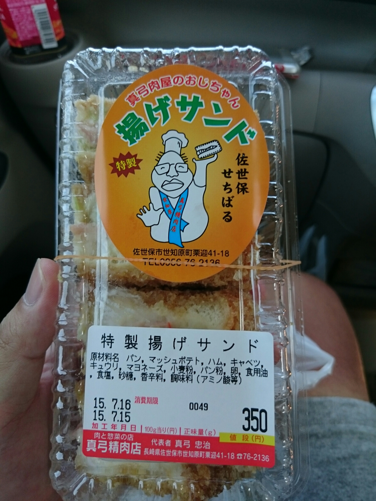 というワケで念願の真弓精肉店の揚げサンド!やっと食べることができました。世知原町からの帰り道は山越え?して佐世保市街地までドライブしてきたのですが、揚げサンドを食べながら自然の中をゆっくり走ってきてとても楽しいドライブになりました。